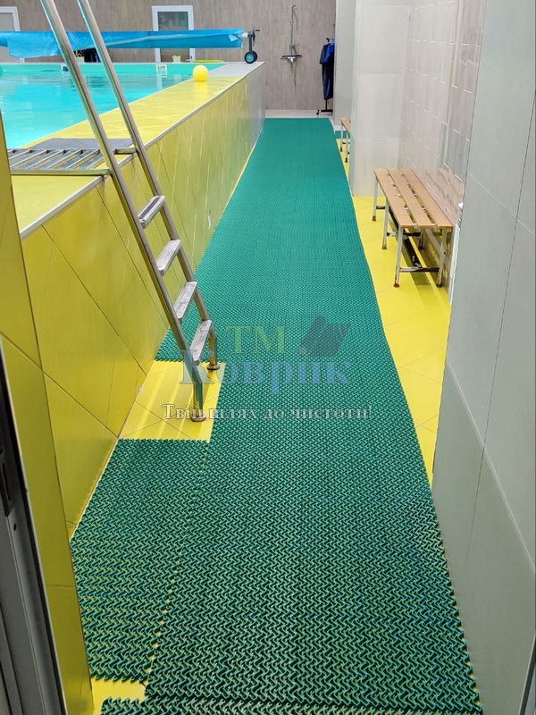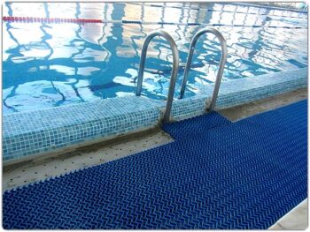 Напольное покрытие для бассейна ” Тетра” из прочного противоскользящего материала ПВХ, напольное покрытие идеальный вариант для опасных зон и уже потерявшего вид пола у чаши. Собирается из модулей при помощи молотка, в любой нужный размер за короткое время. Антискользящую дорожку можно скручивать в рулон, это упрощает уборку помещения и перевозку. Коврики из поливинилхлорида имеют высокий класс износостойкости, не выгорают от солнечного света, не впитывают воду, не боятся жиров и щелочи, выбросите его только когда он Вам надоест.