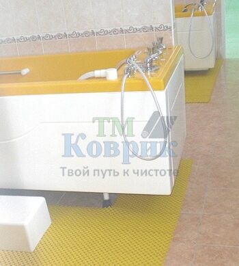 Мелкая структура поверхности напоминает корку апельсина, приятная к голым стопам, не скользит даже при небольших размерах. Не впитывает влагу, легко моется и чистится при помощи бытовых очищающих средств, не выгорает от ультрафиолетовых лучей. Состоит коврик в ванную из модулей, собирается с помощью молотка, может быть любого размера и геометрической формы.